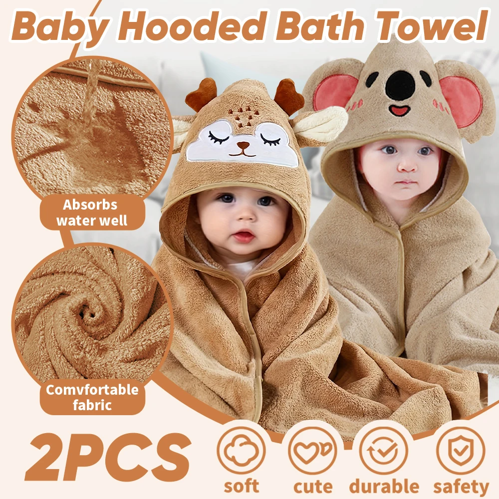 - Cute Animal Designs: One towel features a light brown deer or fawn design with sweet sleeping eyes on the hood, while the other showcases a friendly gray koala with adorable ears and facial features, making bath time fun and engaging for your child.
