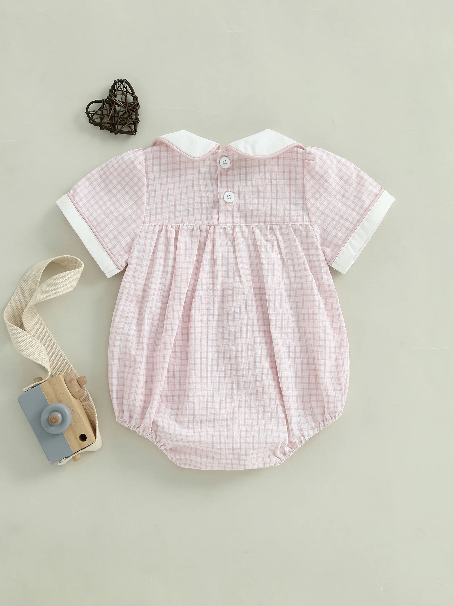 This delightful romper features a classic light blue gingham check pattern, perfect for any occasion. The outfit is beautifully designed with a white Peter Pan collar and short sleeves adorned with elegant white trim, adding a touch of sophistication to your baby's wardrobe.