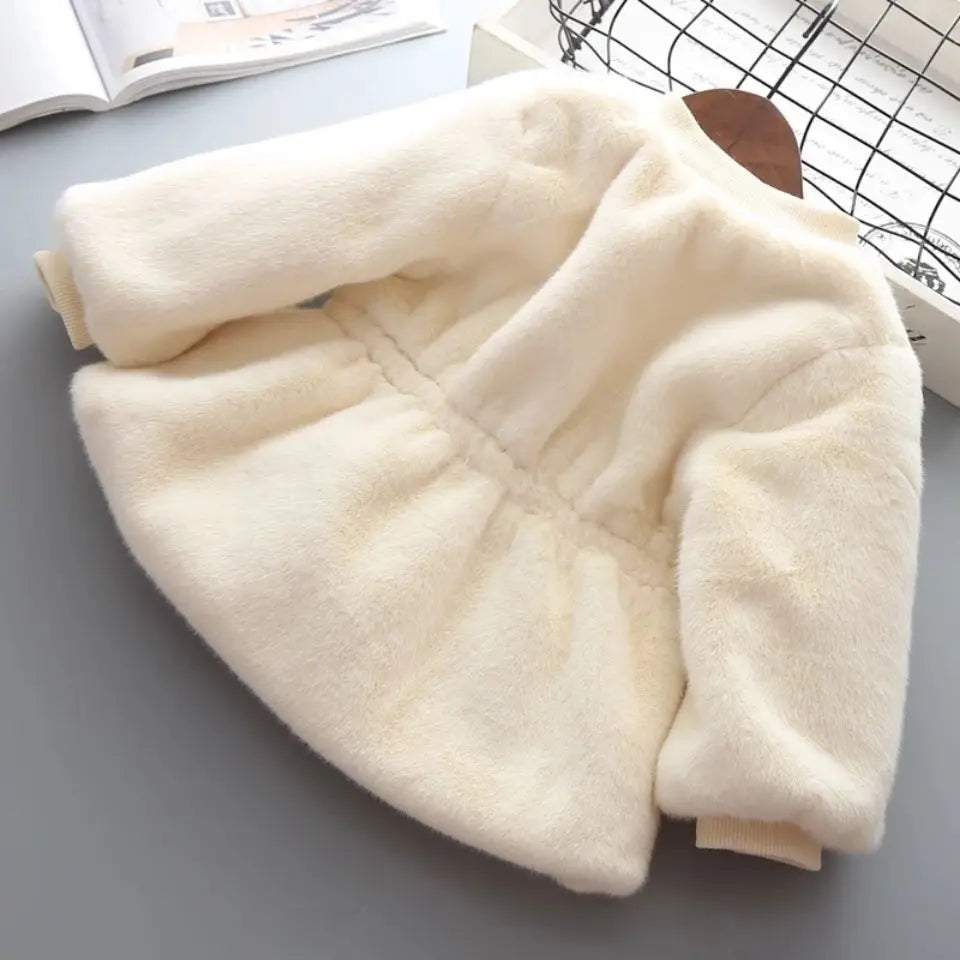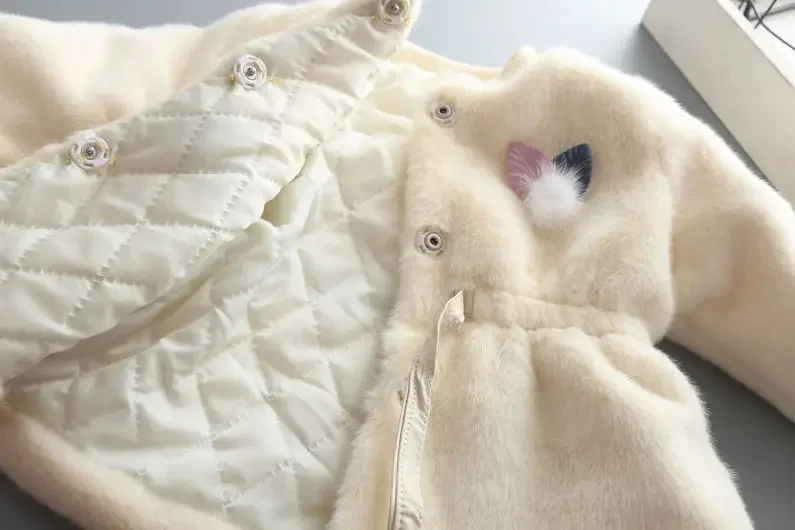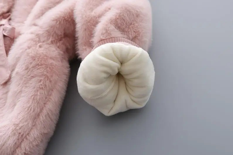 Wrap your little one in warmth and style with our Charming Pink Faux Fur Coat. This delightful jacket features a soft, plush exterior in a lovely light pink hue, complemented by a cozy cream-colored lining at the collar. Adorned with decorative pink ribbon bows and button closures, it combines fashionable details with functionality. The ribbed cuffs and hooded design ensure extra comfort during chilly days. Perfect for winter outings, this stylish outerwear piece is a must-have for any fashionable young child!