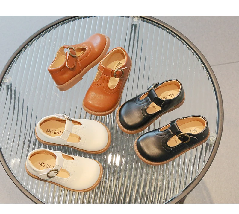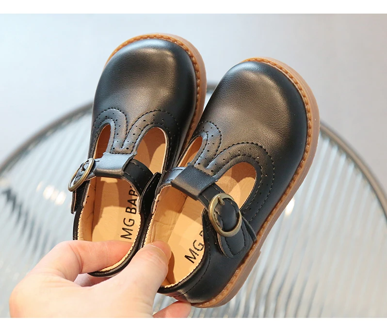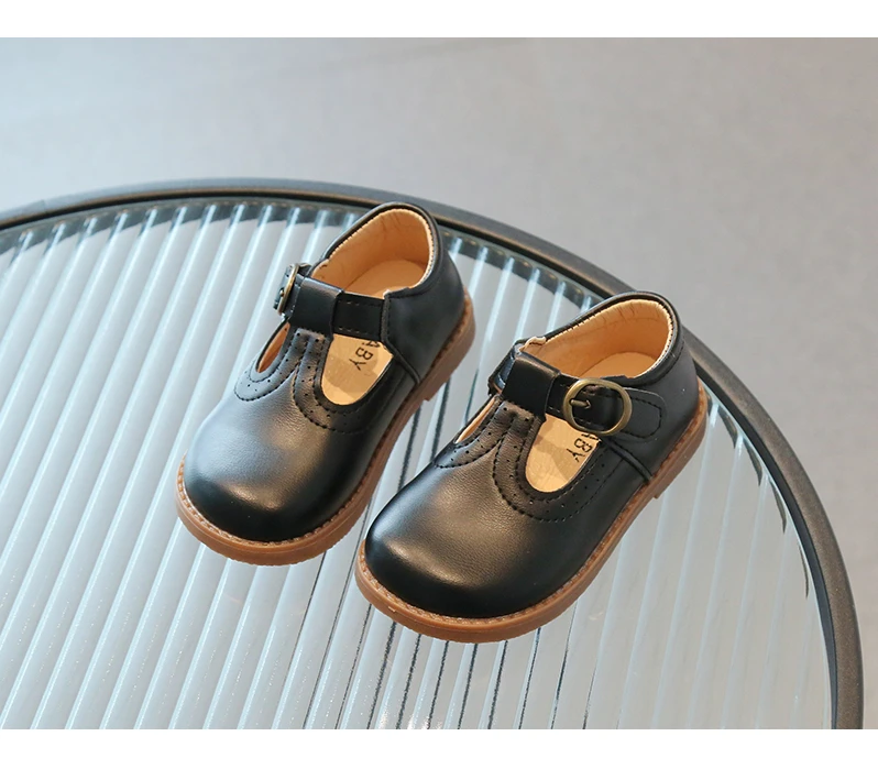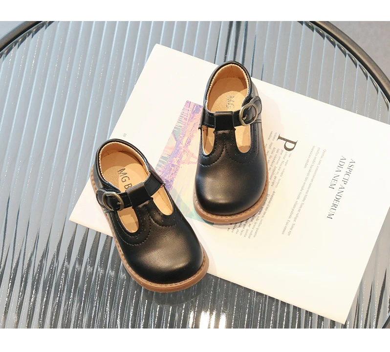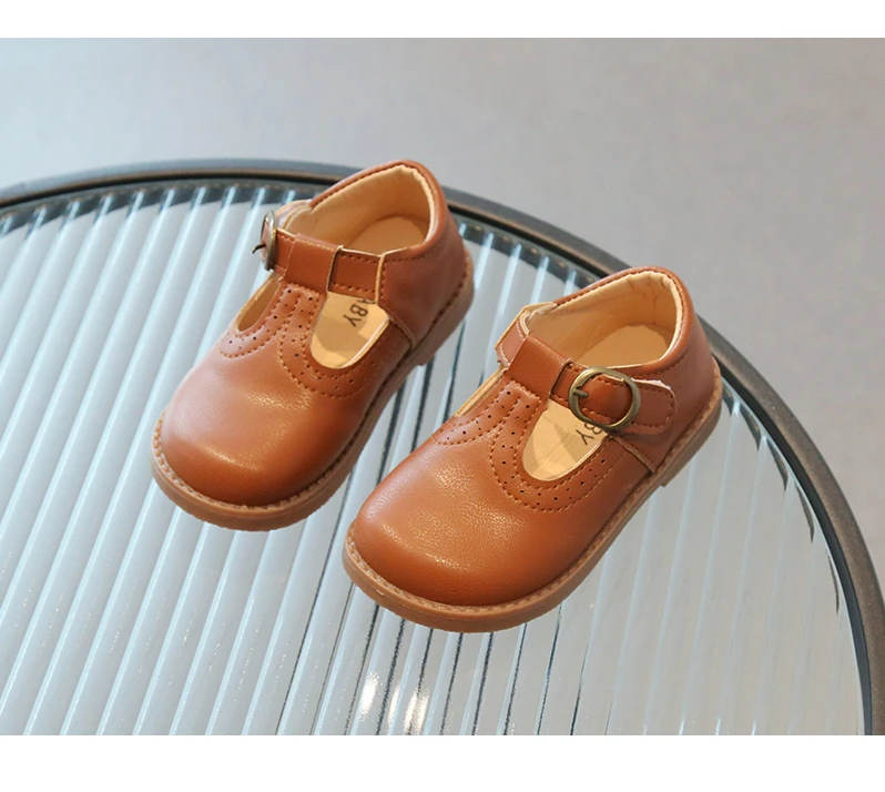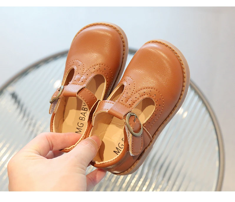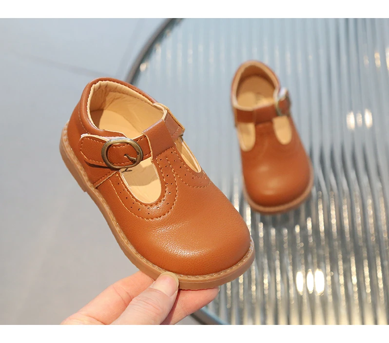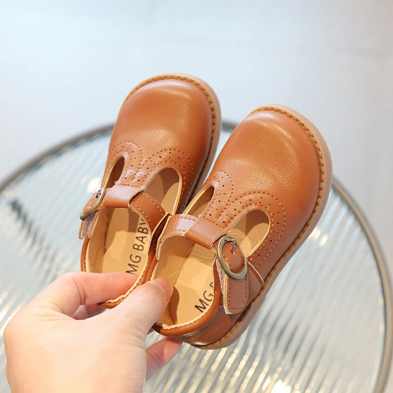 Inside, the shoes are lined with a soft beige or light tan material, enhancing comfort for all-day wear. The flat, matching brown rubber sole offers durability and flexibility, making these shoes suitable for school uniforms, formal occasions, or casual outings. With their simple, traditional aesthetic, these T-strap shoes will effortlessly complement a variety of children's outfits.