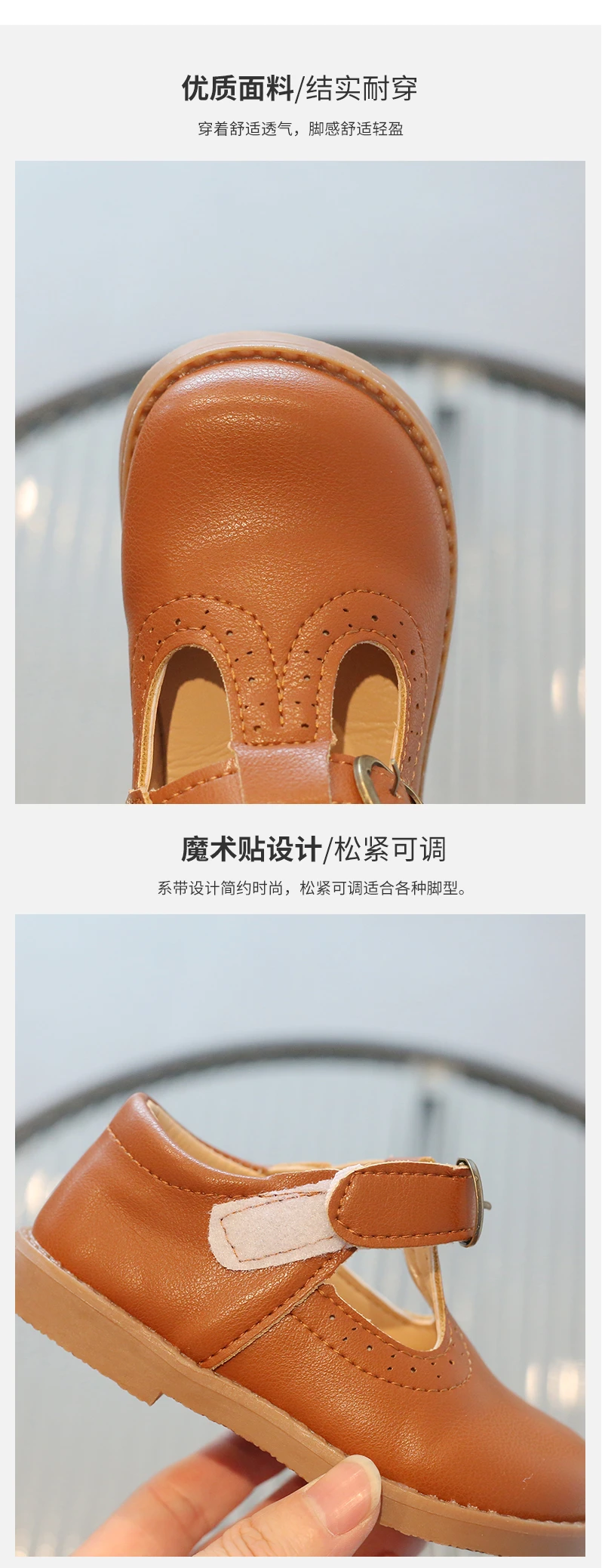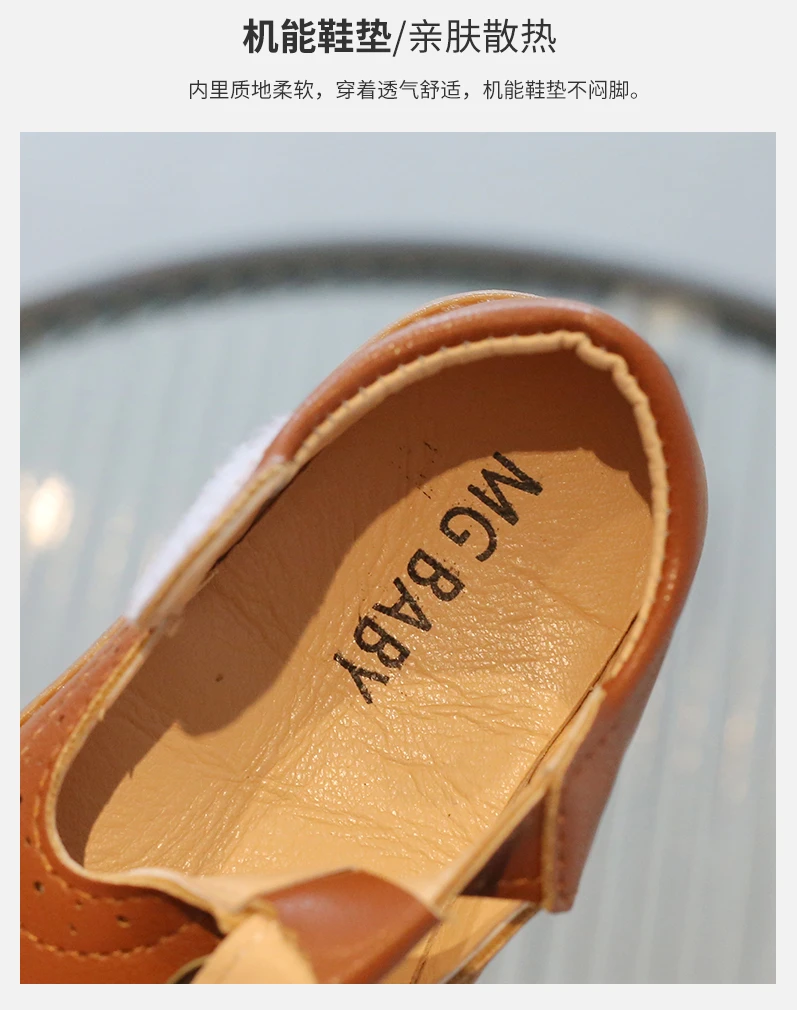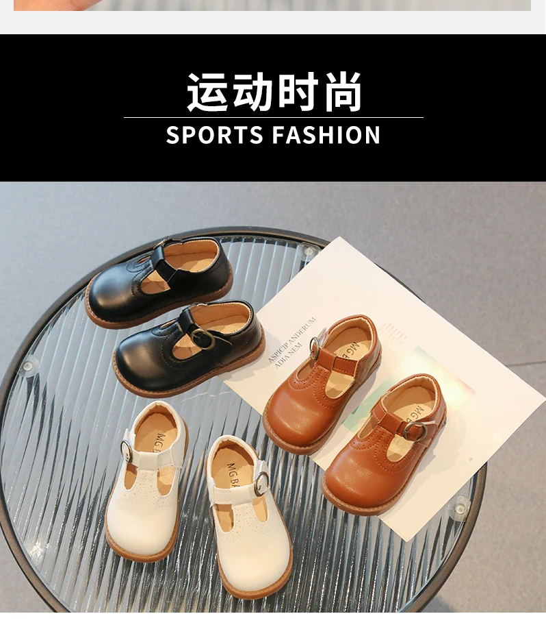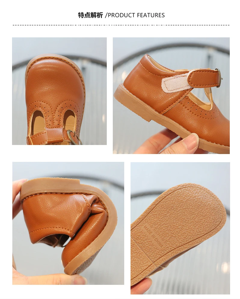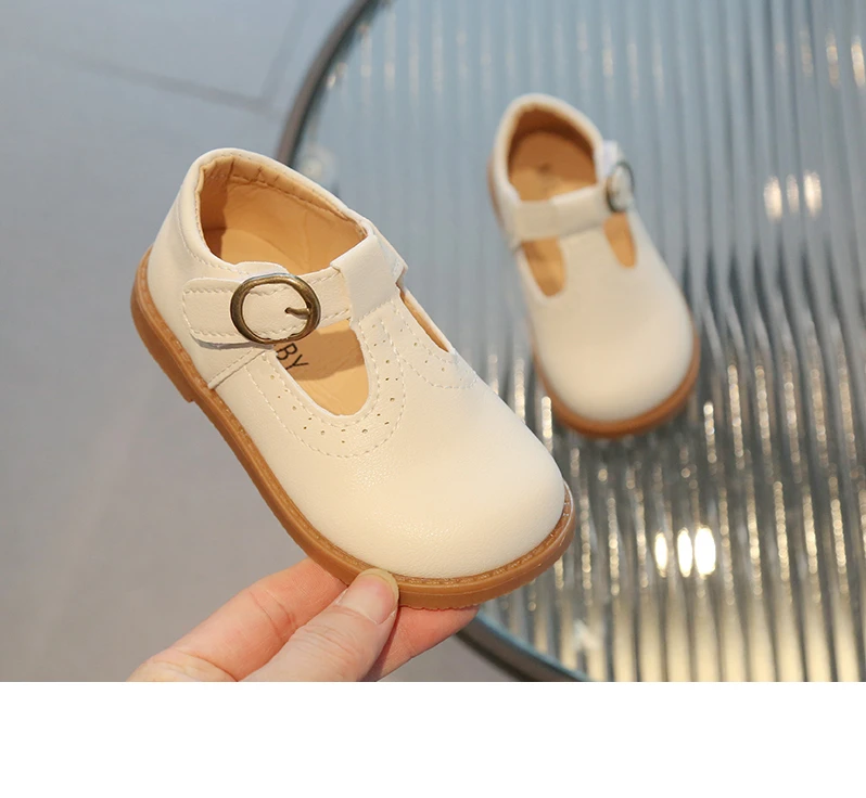 Inside, the shoes are lined with a soft beige or light tan material, enhancing comfort for all-day wear. The flat, matching brown rubber sole offers durability and flexibility, making these shoes suitable for school uniforms, formal occasions, or casual outings. With their simple, traditional aesthetic, these T-strap shoes will effortlessly complement a variety of children's outfits.