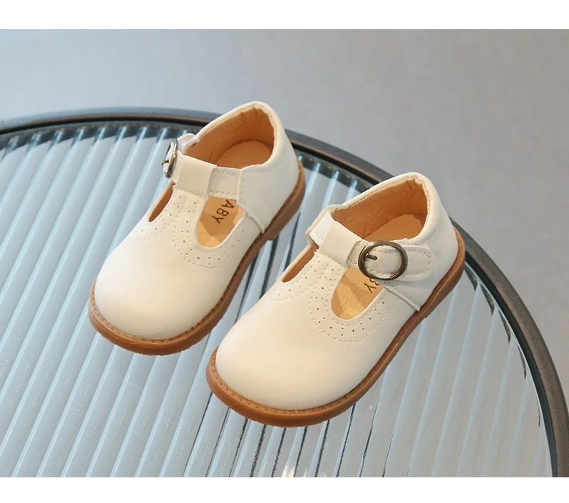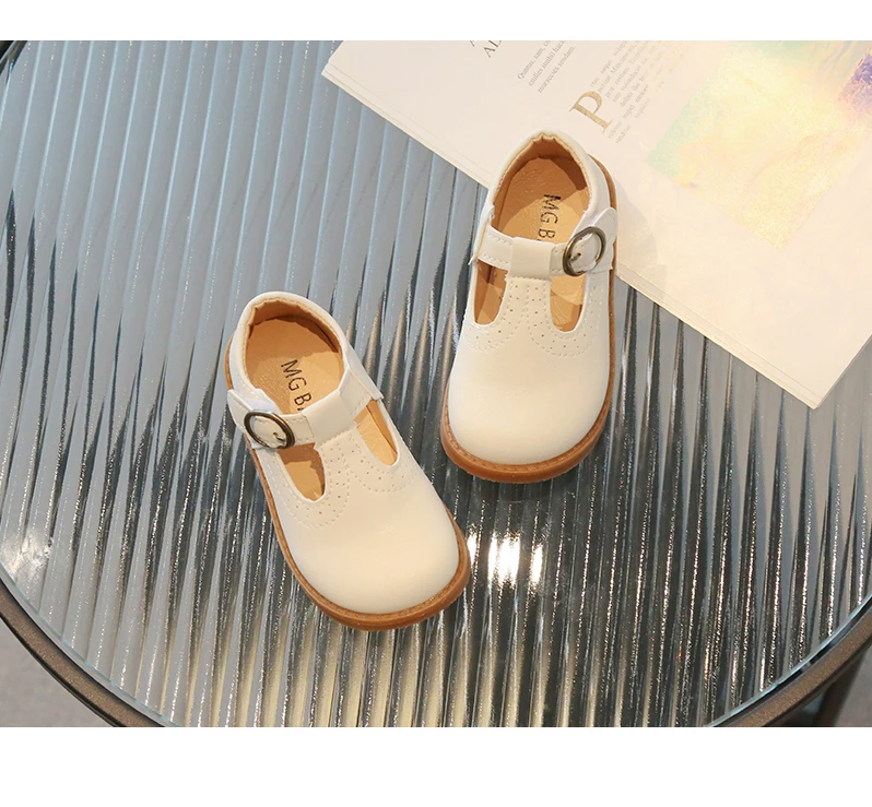 These charming shoes feature a classic Mary Jane design with decorative perforations along the top edge, providing a touch of elegance.
